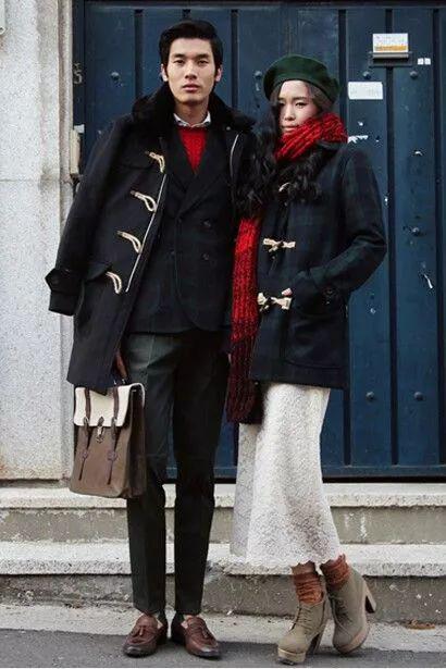 打造新年情侣装,造型很有魅力感,也不会过于张扬个性,一件高识别度的牛角扣大衣加上一些小面积红色单品的点缀,造型就很惬意了。
