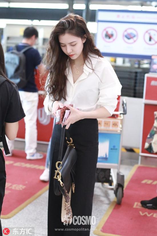 刘亦菲用白衬衫搭配阔腿裤可以说是经典穿搭了,宋妍霏也曾这样搭配现身机场。经典百搭的白衬衫搭配黑色宽松长裤,简约又有魅力。手拎黑色Dior马鞍包,摩登范十足。