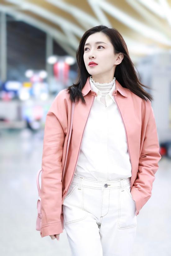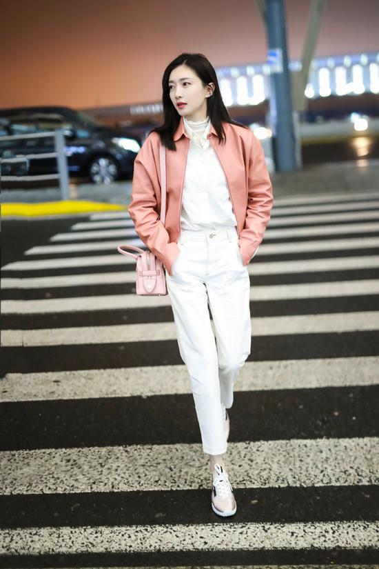 江疏影在前往时装周看秀时就灵活运用了白衬衫,上演时髦的叠穿大法。粉色系皮质外套内搭白衬衫叠搭同色系高领衫,下身搭配一条白色宽松休闲裤,整体LOOK十分清纯好看。