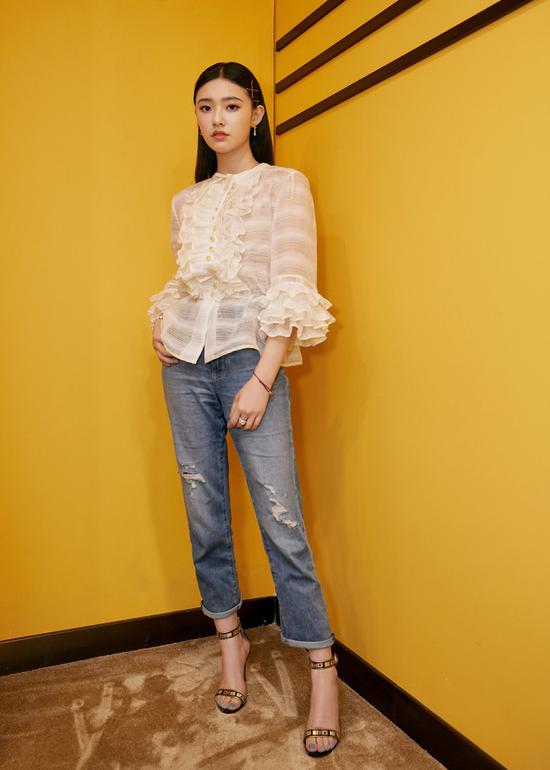 林允前段时间参加活动时也身穿一款带有镂空蕾丝花边装饰的白衬衫亮相,搭配一条直筒牛仔裤,甜美又吸睛。这种带有装饰元素的白衬衫风格更加突出,非常适合可爱女生。